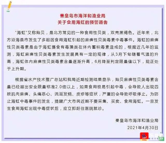 4月30日,秦皇岛市海洋和渔业局发布关于食用海虹的预警通告。通告称,近年来北方沿海县市发生了多起因食用海虹引起的麻痹性贝类毒素中毒事件。根据近几年的监测,海虹麻痹性贝类毒素发生发展具有一定的规律,从3月下旬随着气温的升高,海虹体内麻痹性贝类毒素含量逐渐升高,6月降至判定限量值以下,现正处于上升期。