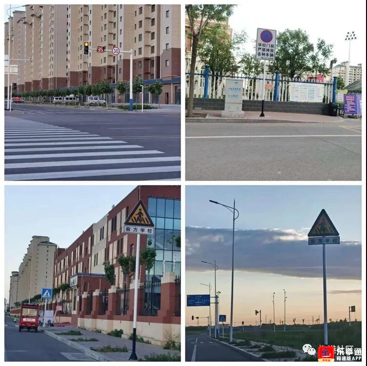 在新建设的第三中学门前两侧安装标志牌及施划标线、在光明大路与第三中学路口新建信号灯、标志标线及电警、第四小学门前两侧安装标志牌等交通设施