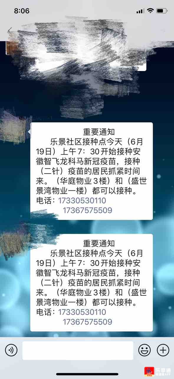 乐景社区接种点今天(6月19日)上午7:30开始接种安徽智飞龙科马新冠疫苗,接种(二针)疫苗的居民抓紧时间来。(华庭物业3楼)和(盛世景湾物业一楼)都可以接种。