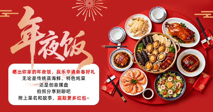 晒出你家的年夜饭,赢乐亭通新春好礼!无论是传统蒸海鲜、特色炖菜,还是创意摆盘,拍照分享到聊吧,附上菜名和故事,赢取更多红包~